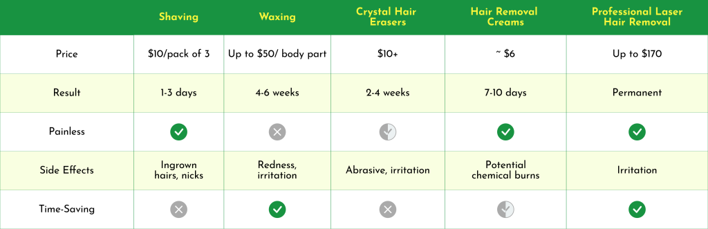 Shaving works to remove the most present body hair on my body, but it isn’t long-lasting. Results only last 1-3 days and costs can rack up overtime when you have to constantly buy razors. Waxing works more effectively than shaving, but it’s a commitment because you have to go back often. Crystal hair erasers and hair removal creams were just not for me point blank. Though the results last longer than shaving, the abrasiveness of hair erasers was painful and the inconsistency and smell of hair removal creams was something I couldn’t get behind.
